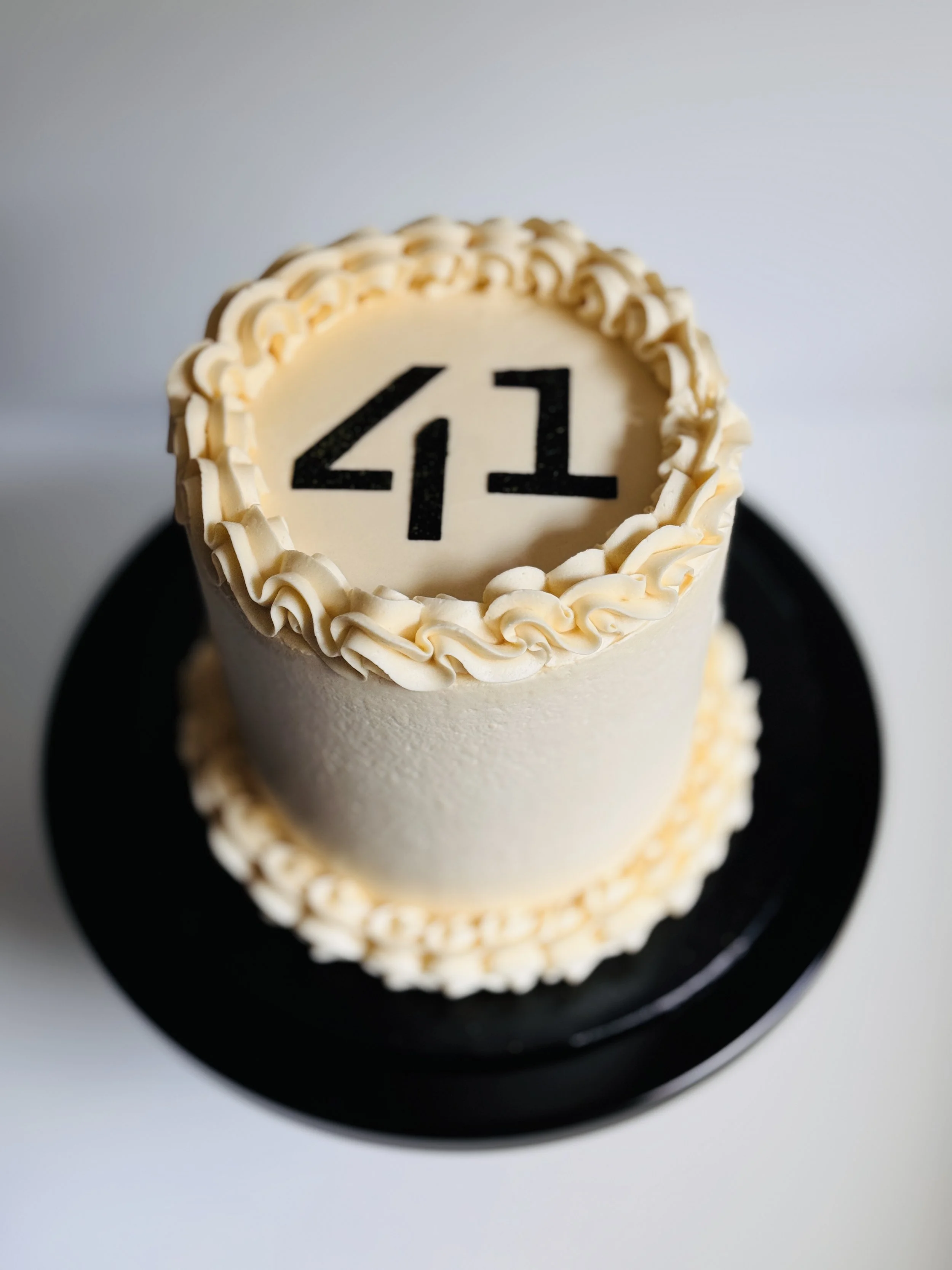 Sleek & Simple comes with a small rope border, in a color of your choosing. To add 24K gold leaf or a phrase, go to “Add-ons” on the menu page. Please note: all cake writing will be piped by hand; no custom stencils (as pictured on cake) available.